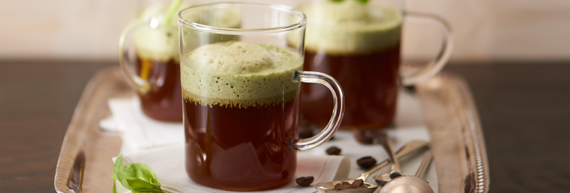 Káva a hovězí vývar s mléčnou pěnou a bazalkou