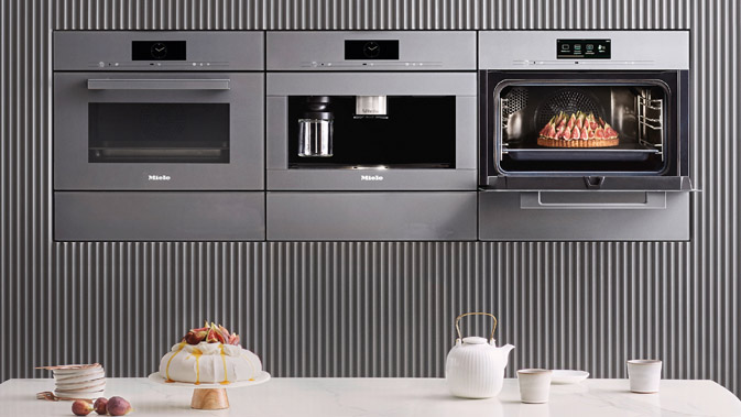 Vestavné spotřebiče Miele v designu VitroLine, zde v barevném provedení grafitově šedá: kombinovaná parní trouba, kávovar, kompaktní trouba v kombinaci s mikrovlnnou troubou plus dva nahřívače a jedna vakuovací zásuvka jsou vším, co byste si mohli přát.