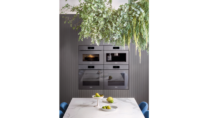 Vestavné spotřebiče nové generace 7000 od Miele jsou intuitivní a usnadňují práci. Na fotografii je kombinace spotřebičů designové řady ArtLine bez rukojeti v barvě grafitově šedá.