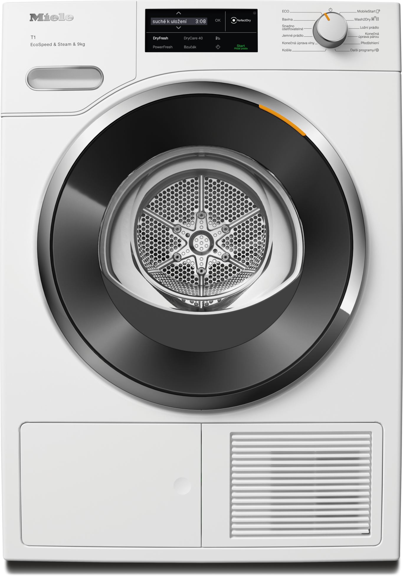 - 5.Úspora času vypočítaná v porovnání se sušičkami Miele bez systému EcoSpeed se stejným množstvím naplnění a podobnou energetickou účinností. Testováno v programu „Bavlna“ při plném naplnění.